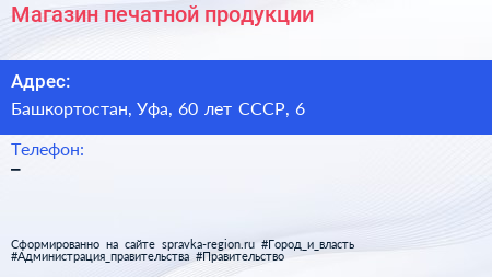 Магазин печатной продукции по адресу Башкортостан, Уфа, 60 лет СССР, 6 в дальнейшем Организация, размещена в следующих категориях: