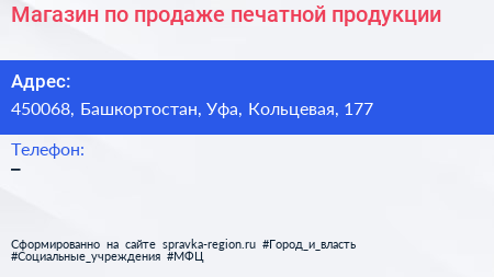Магазин по продаже печатной продукции по адресу 450068, Башкортостан, Уфа, Кольцевая, 177 в дальнейшем Организация, размещена в следующих категориях:
