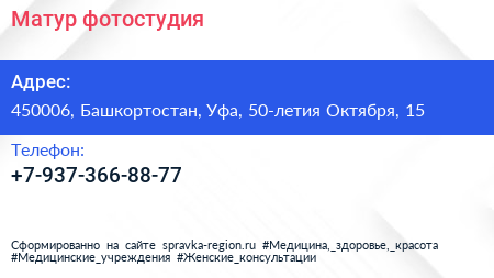 Матур, фотостудия по адресу 450006, Башкортостан, Уфа, 50-летия Октября, 15 в дальнейшем Организация, размещена в следующих категориях: