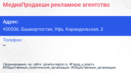 МедиаПродакшн, рекламное агентство по адресу 450106, Башкортостан, Уфа, Караидельская, 2 в дальнейшем Организация, размещена в следующих категориях:
