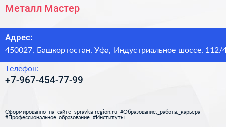 Металл Мастер по адресу 450027, Башкортостан, Уфа, Индустриальное шоссе, 112/4 в дальнейшем Организация, размещена в следующих категориях: