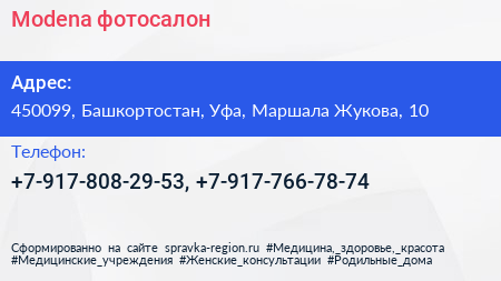 Modena, фотосалон по адресу 450099, Башкортостан, Уфа, Маршала Жукова, 10 в дальнейшем Организация, размещена в следующих категориях: