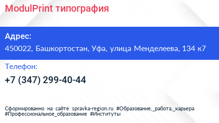 ModulPrint, типография по адресу 450022, Башкортостан, Уфа, улица Менделеева, 134 к7 в дальнейшем Организация, размещена в следующих категориях: