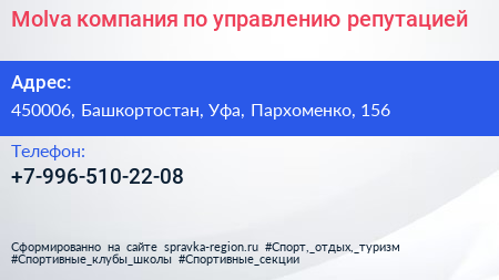 Molva, компания по управлению репутацией по адресу 450006, Башкортостан, Уфа, Пархоменко, 156 в дальнейшем Организация, размещена в следующих категориях: