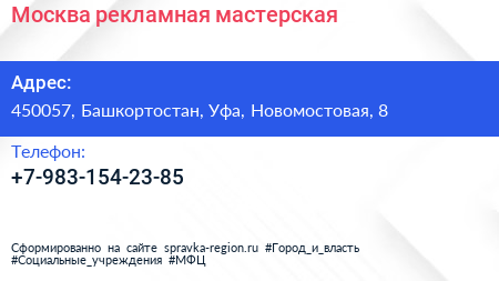 Москва, рекламная мастерская по адресу 450057, Башкортостан, Уфа, Новомостовая, 8 в дальнейшем Организация, размещена в следующих категориях: