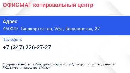 ОФИСМАГ, копировальный центр по адресу 450047, Башкортостан, Уфа, Бакалинская, 27 в дальнейшем Организация, размещена в следующих категориях: