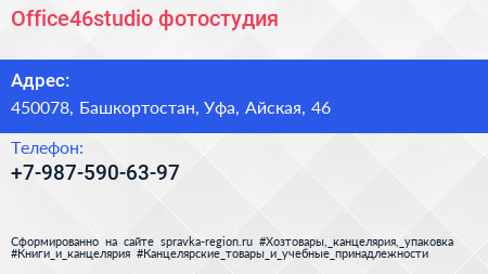 Office46studio, фотостудия по адресу 450078, Башкортостан, Уфа, Айская, 46 в дальнейшем Организация, размещена в следующих категориях: