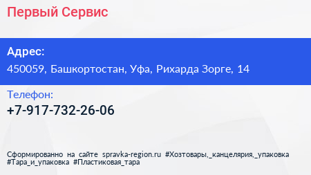 Первый Сервис по адресу 450059, Башкортостан, Уфа, Рихарда Зорге, 14 в дальнейшем Организация, размещена в следующих категориях: