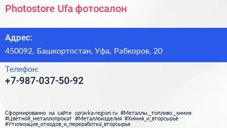 Photostore-Ufa, фотосалон по адресу 450092, Башкортостан, Уфа, Рабкоров, 20 в дальнейшем Организация, размещена в следующих категориях:
