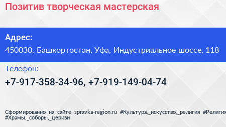 Позитив, творческая мастерская по адресу 450030, Башкортостан, Уфа, Индустриальное шоссе, 118 в дальнейшем Организация, размещена в следующих категориях: