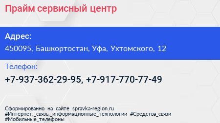 Прайм, сервисный центр по адресу 450095, Башкортостан, Уфа, Ухтомского, 12 в дальнейшем Организация, размещена в следующих категориях: