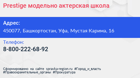 Prestige, модельно-актерская школа по адресу 450077, Башкортостан, Уфа, Мустая Карима, 16 в дальнейшем Организация, размещена в следующих категориях: