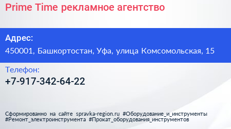 Prime Time, рекламное агентство по адресу 450001, Башкортостан, Уфа, улица Комсомольская, 15 в дальнейшем Организация, размещена в следующих категориях:
