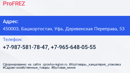 ProFREZ по адресу 450003, Башкортостан, Уфа, Деревенская Переправа, 53 в дальнейшем Организация, размещена в следующих категориях: