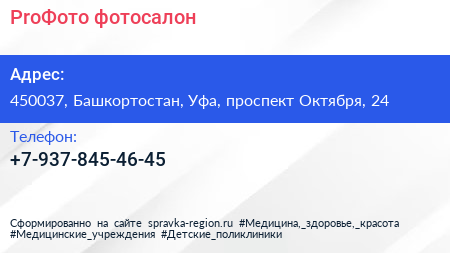 ProФото, фотосалон по адресу 450037, Башкортостан, Уфа, проспект Октября, 24 в дальнейшем Организация, размещена в следующих категориях: