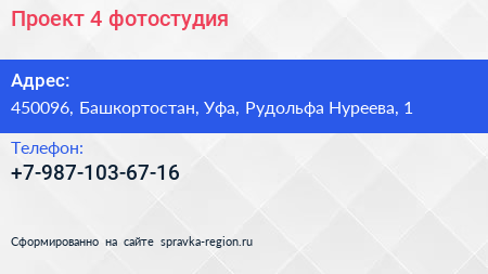 Проект 4, фотостудия по адресу 450096, Башкортостан, Уфа, Рудольфа Нуреева, 1 в дальнейшем Организация, размещена в следующих категориях: