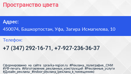 Пространство цвета по адресу 450074, Башкортостан, Уфа, Загира Исмагилова, 10 в дальнейшем Организация, размещена в следующих категориях: