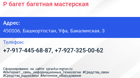 Р-багет, багетная мастерская по адресу 450106, Башкортостан, Уфа, Бакалинская, 3 в дальнейшем Организация, размещена в следующих категориях: