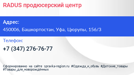 RADUS, продюсерский центр по адресу 450006, Башкортостан, Уфа, Цюрупы, 156/3 в дальнейшем Организация, размещена в следующих категориях: