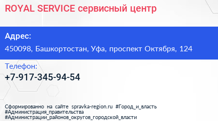 ROYAL SERVICE, сервисный центр по адресу 450098, Башкортостан, Уфа, проспект Октября, 124 в дальнейшем Организация, размещена в следующих категориях: