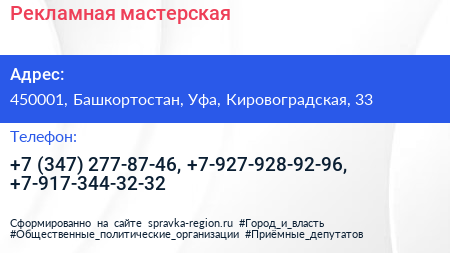 Рекламная мастерская по адресу 450001, Башкортостан, Уфа, Кировоградская, 33 в дальнейшем Организация, размещена в следующих категориях: