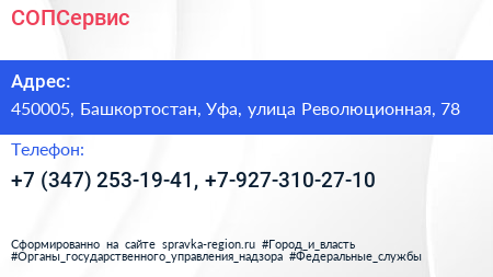 СОПСервис по адресу 450005, Башкортостан, Уфа, улица Революционная, 78 в дальнейшем Организация, размещена в следующих категориях: