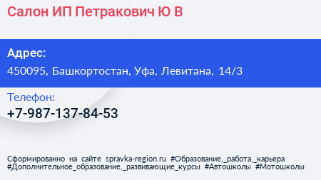 Салон, ИП Петракович Ю.В. по адресу 450095, Башкортостан, Уфа, Левитана, 14/3 в дальнейшем Организация, размещена в следующих категориях:
