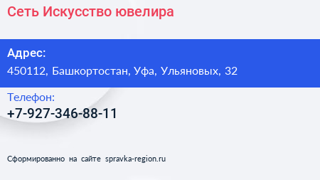 Сеть Искусство ювелира по адресу 450112, Башкортостан, Уфа, Ульяновых, 32 в дальнейшем Организация, размещена в следующих категориях: