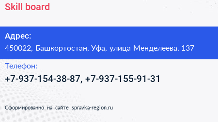 Skill board по адресу 450022, Башкортостан, Уфа, улица Менделеева, 137 в дальнейшем Организация, размещена в следующих категориях: