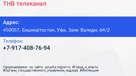ТНВ, телеканал по адресу 450057, Башкортостан, Уфа, Заки Валиди, 64/2 в дальнейшем Организация, размещена в следующих категориях: