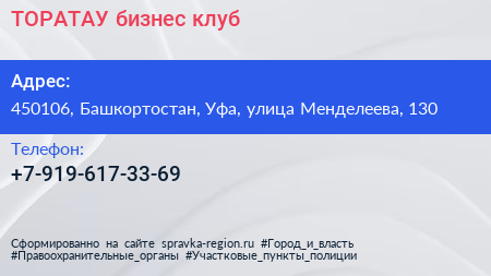 ТОРАТАУ, бизнес-клуб по адресу 450106, Башкортостан, Уфа, улица Менделеева, 130 в дальнейшем Организация, размещена в следующих категориях: