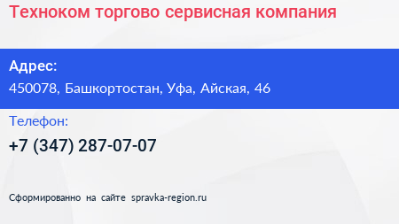 Техноком, торгово-сервисная компания по адресу 450078, Башкортостан, Уфа, Айская, 46 в дальнейшем Организация, размещена в следующих категориях: