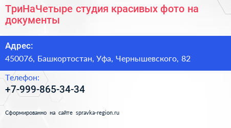 ТриНаЧетыре, студия красивых фото на документы по адресу 450076, Башкортостан, Уфа, Чернышевского, 82 в дальнейшем Организация, размещена в следующих категориях: