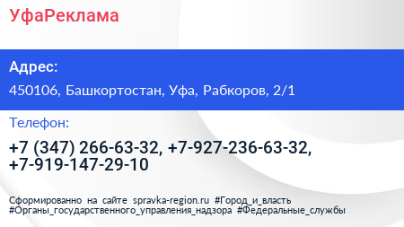 Для связи с организацией воспользуйтесь номером телефона: +7 (347) 266-63-32, +7-927-236-63-32, +7-919-147-29-10. Пн: c 10:00-18:00, Вт: c 10:00-18:00, Ср: c 10:00-18:00, Чт: c 10:00-18:00, Пт: c 10:00-18:00, Сб: c 10:00-18:00, Вс: выходной, вы можете обратиться в эту организацию.