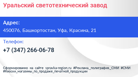 Уральский светотехнический завод по адресу 450076, Башкортостан, Уфа, Красина, 21 в дальнейшем Организация, размещена в следующих категориях: