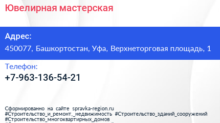 Ювелирная мастерская по адресу 450077, Башкортостан, Уфа, Верхнеторговая площадь, 1 в дальнейшем Организация, размещена в следующих категориях:
