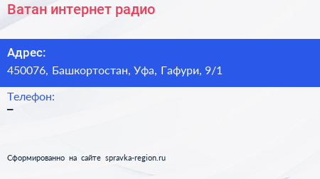 Ватан, интернет-радио по адресу 450076, Башкортостан, Уфа, Гафури, 9/1 в дальнейшем Организация, размещена в следующих категориях: