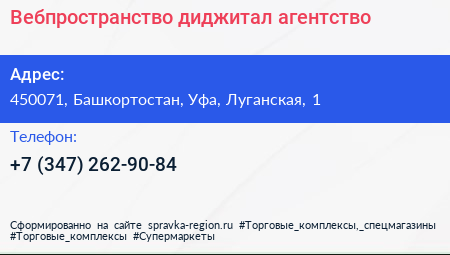 Вебпространство, диджитал-агентство по адресу 450071, Башкортостан, Уфа, Луганская, 1 в дальнейшем Организация, размещена в следующих категориях: