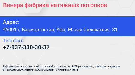 Венера, фабрика натяжных потолков по адресу 450015, Башкортостан, Уфа, Малая Силикатная, 31 в дальнейшем Организация, размещена в следующих категориях: