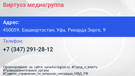 Виртуоз, медиагруппа по адресу 450059, Башкортостан, Уфа, Рихарда Зорге, 9 в дальнейшем Организация, размещена в следующих категориях: