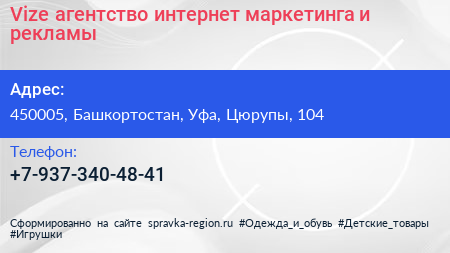 Vize, агентство интернет-маркетинга и рекламы по адресу 450005, Башкортостан, Уфа, Цюрупы, 104 в дальнейшем Организация, размещена в следующих категориях: