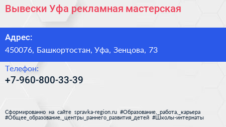 Вывески Уфа, рекламная мастерская по адресу 450076, Башкортостан, Уфа, Зенцова, 73 в дальнейшем Организация, размещена в следующих категориях: