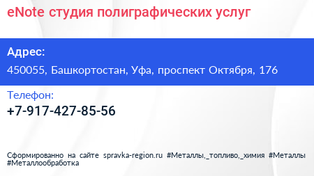 eNote, студия полиграфических услуг по адресу 450055, Башкортостан, Уфа, проспект Октября, 176 в дальнейшем Организация, размещена в следующих категориях: