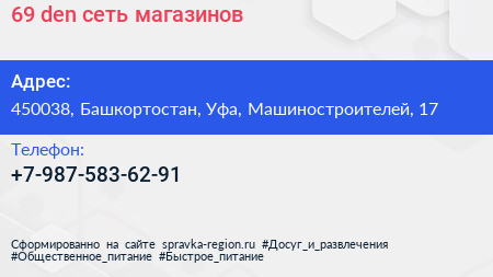 69 den, сеть магазинов по адресу 450038, Башкортостан, Уфа, Машиностроителей, 17 в дальнейшем Организация, размещена в следующих категориях: