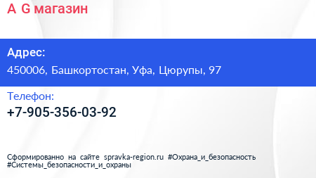 A & G, магазин по адресу 450006, Башкортостан, Уфа, Цюрупы, 97 в дальнейшем Организация, размещена в следующих категориях: