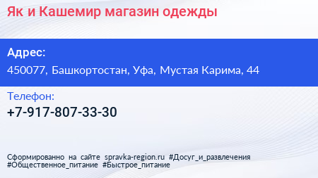 Як и Кашемир, магазин одежды по адресу 450077, Башкортостан, Уфа, Мустая Карима, 44 в дальнейшем Организация, размещена в следующих категориях: