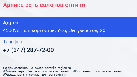 Арника, сеть салонов оптики по адресу 450096, Башкортостан, Уфа, Энтузиастов, 20 в дальнейшем Организация, размещена в следующих категориях:
