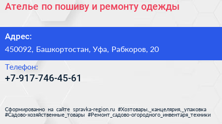 Ателье по пошиву и ремонту одежды по адресу 450092, Башкортостан, Уфа, Рабкоров, 20 в дальнейшем Организация, размещена в следующих категориях: