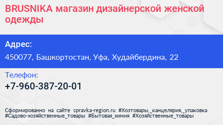 BRUSNIKA, магазин дизайнерской женской одежды по адресу 450077, Башкортостан, Уфа, Худайбердина, 22 в дальнейшем Организация, размещена в следующих категориях: