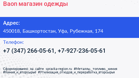 Baon, магазин одежды по адресу 450018, Башкортостан, Уфа, Рубежная, 174 в дальнейшем Организация, размещена в следующих категориях: